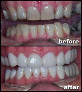 In this patient we found several broken teeth and many with large fillings. The rest were either discolored, misshapen, or susceptible to breakage.