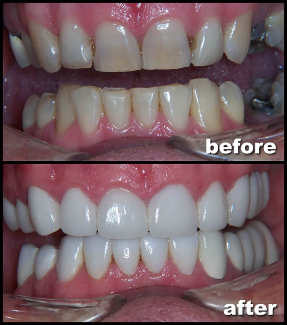 Treatment for this patient included beautiful porcelain crowns for individual teeth in both arches. We also replaced missing teeth with porcelain bridges.