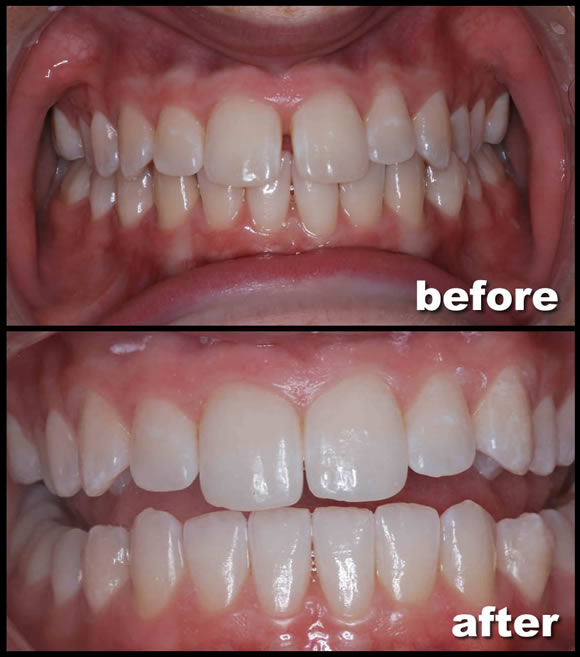 This 17-year-old girl had a simple yet obvious case. She did not like the space between her front teeth. To correct this problem, we could have filled her front teeth with composite bonding to close the space artificially, but she would have needed continued maintenance on the bonding and it would have made her front teeth look too big.