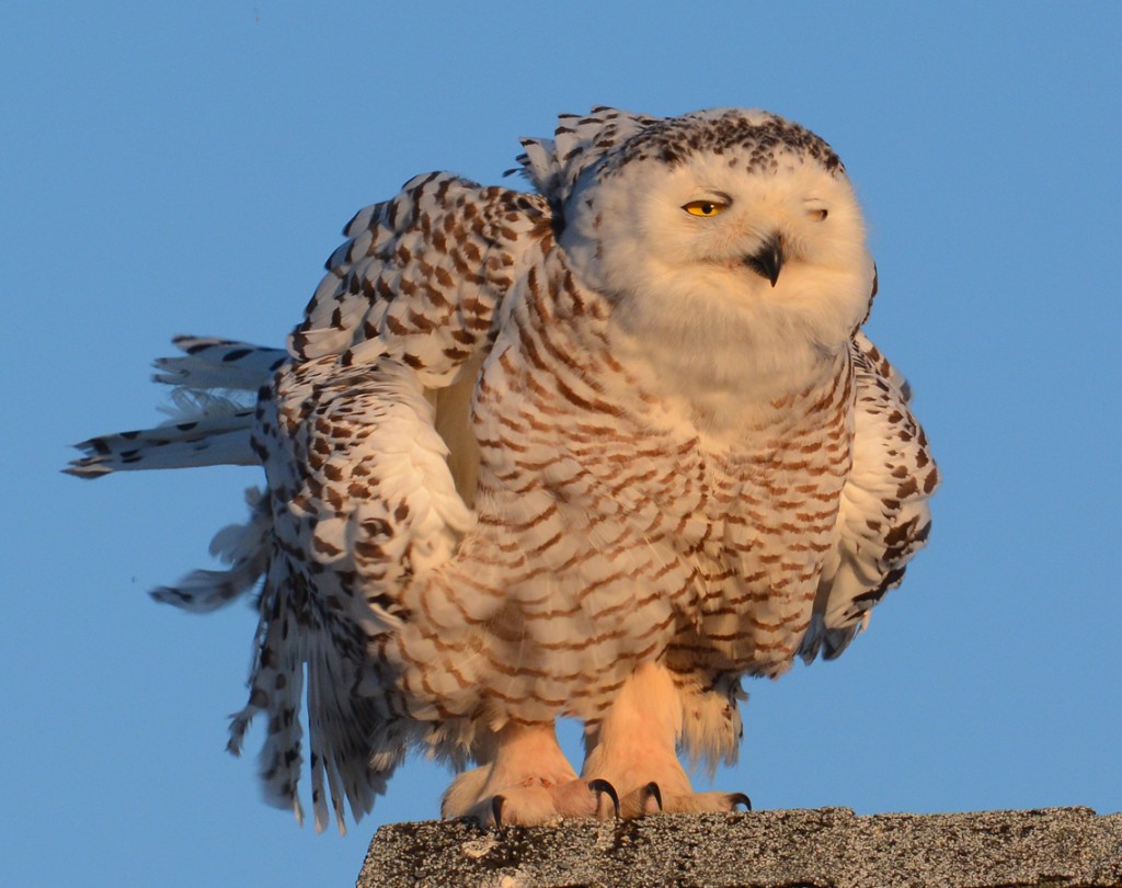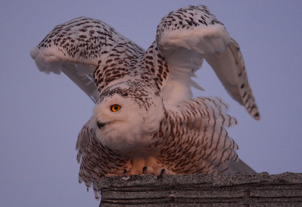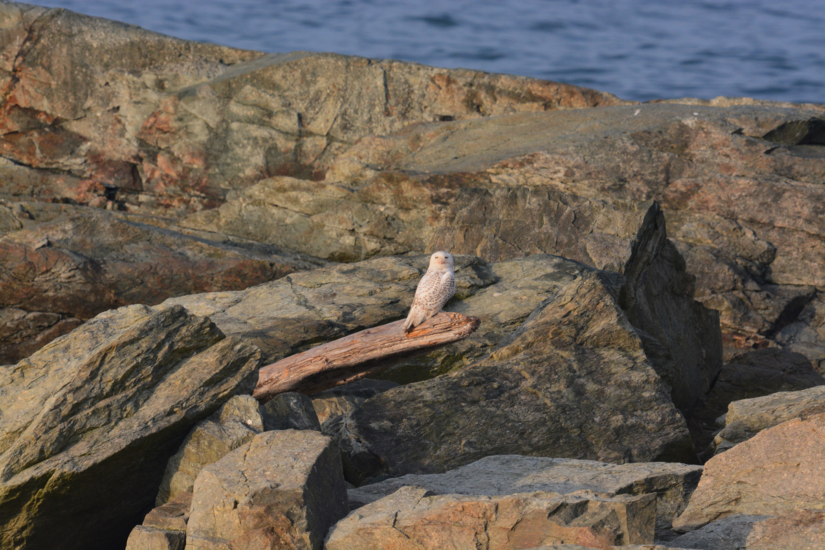 The lovely female Snowy from Rye, New Hampshire, really stole the show! She usually perched on various cottages, with an adoring crowd gathered below. The afternoon of the snow storm it cleared up a bit but the winds were howling and I watched her fly from a rooftop to the beach area. It took 2 people to eventually find where she had landed… on a rock next to another bigger rock serving as a wind break so she could preserve a bit more energy in the sub-zero temperatures. Several of her admirers saw me photographing and visited for a while but none could take the frigid cold for too long. I stayed until sunset, over 3 hours in all in wickedly cold weather, and I needed all 6 layers of clothing (including three winter coats!) to keep me from freezing to death. There were times when I pressed the shutter release and nothing happened because I couldn’t feel my hands any longer.