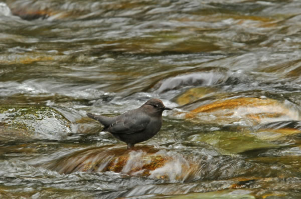 North of Victoria there is a splendid temperate rainforest called Goldstream Park, with a lovely whitewater stream framed by old growth trees covered with green moss and patches of ferns. American Dippers love this place, and I was excited to have another chance to photograph these most uncharacteristic waterbirds, having gotten some okay shots a decade earlier near the Oregon Coast. Just as Glenn promised, there were a few little dark gray dippers working the rapids… plunging in, zipping here, zooming there, always on the move. And there was virtually no light to work with! Regardless, I had this inspiration to make a wispy river habitat shot at 1/10 a second exposure with a 600 mm lens on a monopod! This was a most ambitious shot for such a spastic subject as the dipper, but I could see the shot in my mind. I must have clicked off a hundred pictures when he entered the rapids, knowing that the bird would blur for most shots and my own movement would mess up other shots at a very slow shutter speed. By the Grace of God alone, a few shots were quite interesting. Viva Victoria! Long live the Queen!!