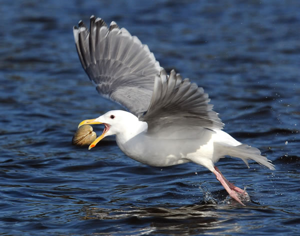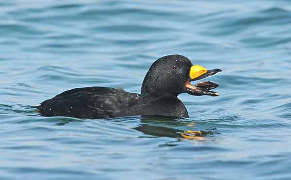 Before the group tour commenced I made a solo journey to Qualicum Beach (about two hours north by car) where Glenn said that I would likely encounter all three scoter species at close range. Just as I arrived for the noon high tide, the gray skies parted and the sun broke out, turning the flat water a heavenly blue which is very important for photographing mostly black ducks. At Qualicum there’s plenty of shellfish, and the ducks are used to locals walking on the beach, so I was able to position myself to intercept the rafts of mostly Black Scoters fishing the shallows. Several White-winged Scoters also joined in and surfaced with big clams in their bills. This I waited a long time to see, as I remember passing a raft of scoters in California, but too far away to shoot. Those big orange knobs on their bills are dashing, but little did I know that I would have to wait 12 years to see up close!