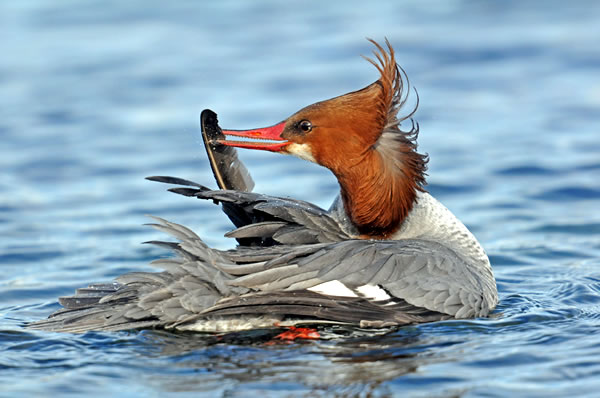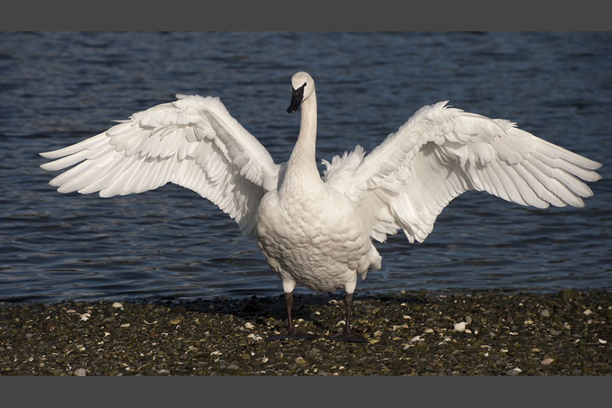 Esquimalt Lagoon is also home to swans, mostly the orange-billed Mute Swan, a native of Europe. Several pairs were engaged in courtship display, arching their angelic white wings over the back. In one split second, the heads of one pair crossed to form a heart, a most fitting symbol for these lovebirds! A lone Trumpeter Swan also winters on the lagoon, and he gave me a glorious wingflap sequence while preening on the beach. I love all the detail in the whites, something that digital photography highlights beautifully.